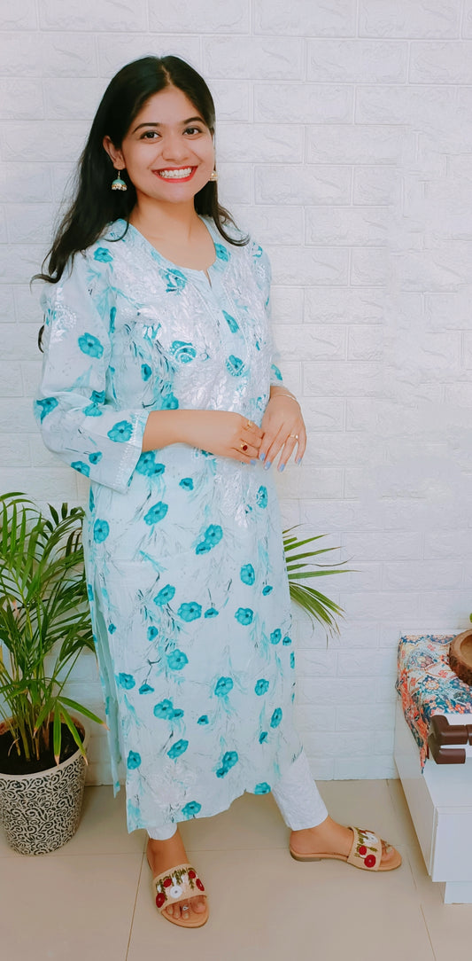 Label Aja Hand Embroidered Printed Mulmul Lucknowi Chikanakri long kurta
