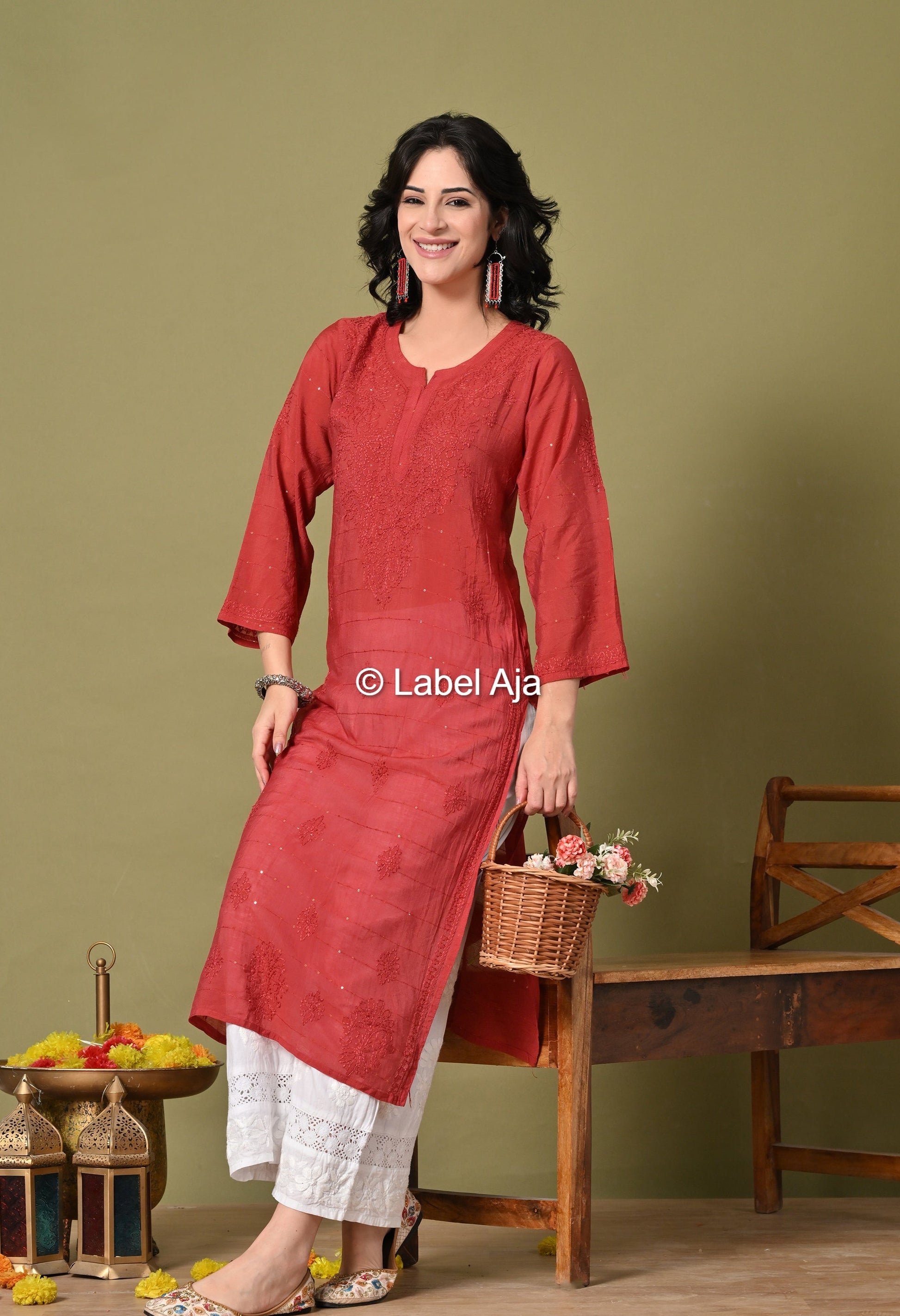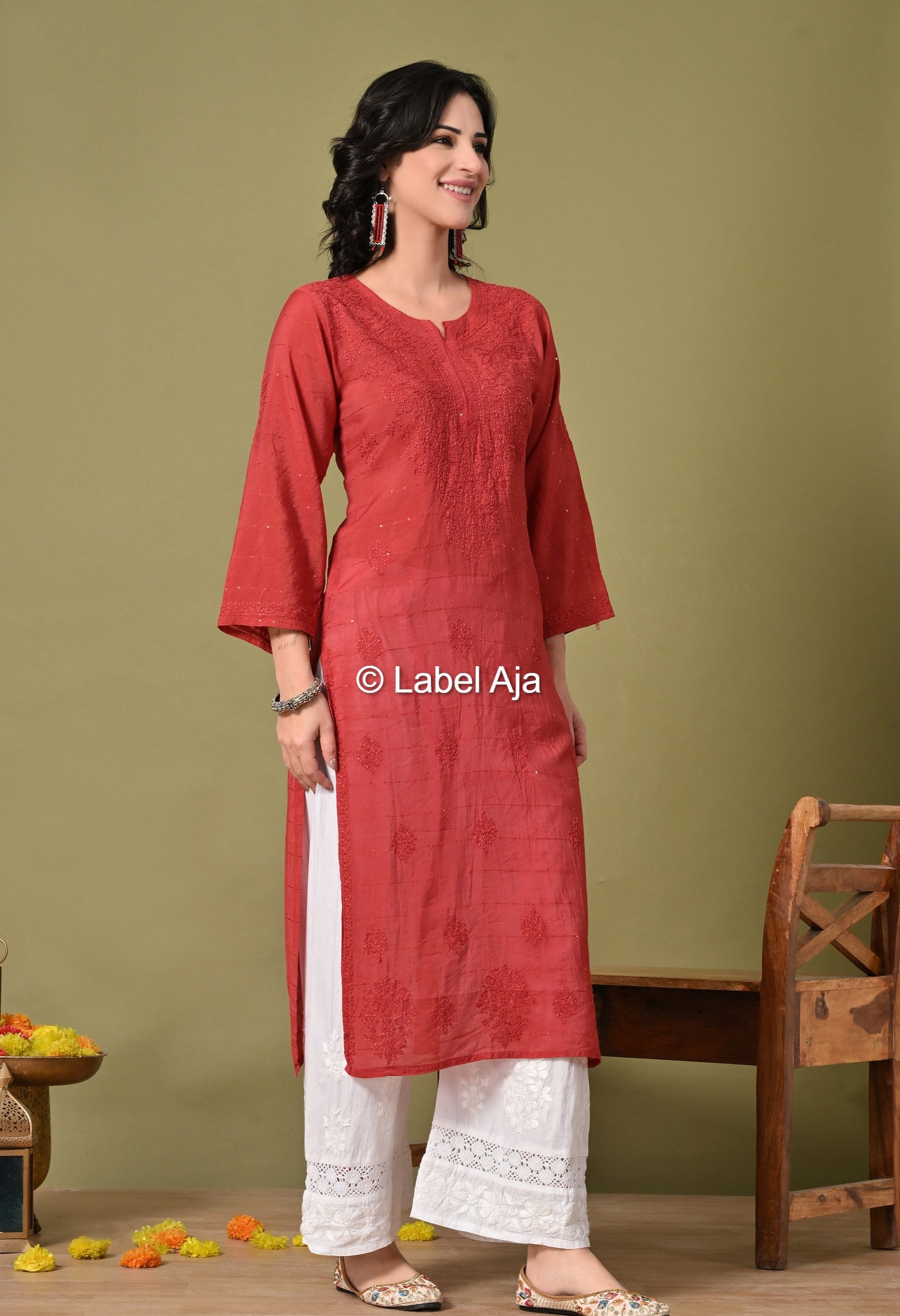 Jhilmil Chanderi silk Chikankari kurti in Sequence and bakhiya work